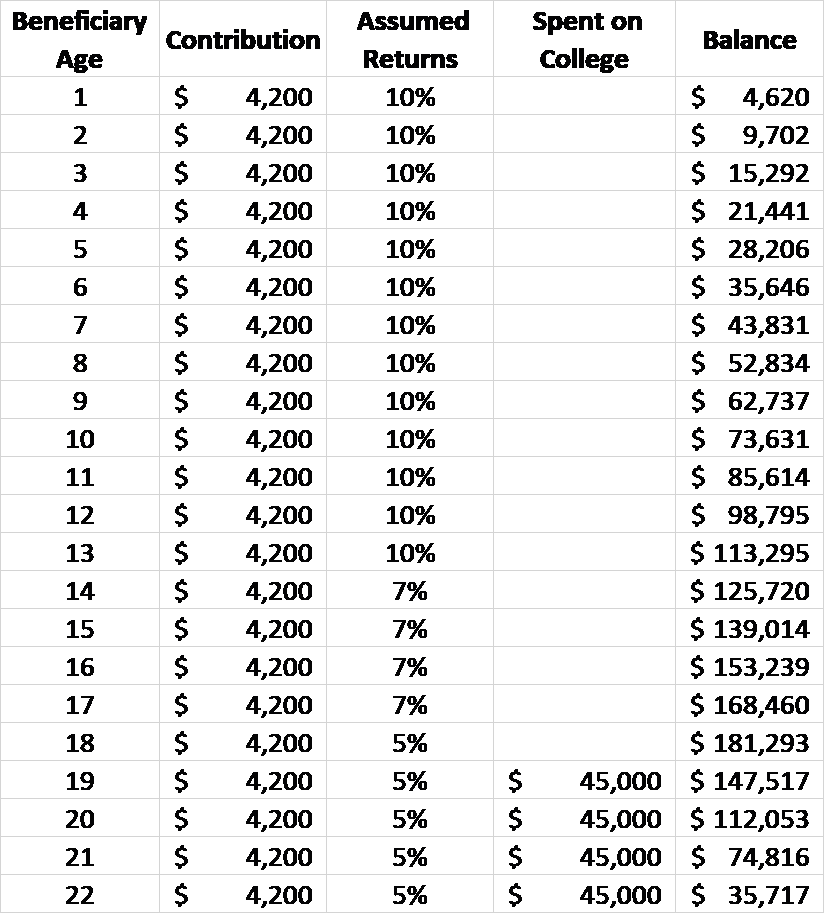 First, as a caveat, few people can afford to place $4200 a year into their kid’s 529 plan each year from their birth until they graduate from college. I certainly wasn’t in such a position for any of my kids.