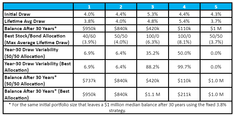 The above-mentioned Morningstar report examined five such dynamic methods and what each offers for a 90% success rate (i.e., 900 out of 1000 simulated scenarios don’t run out of money for 30 years).